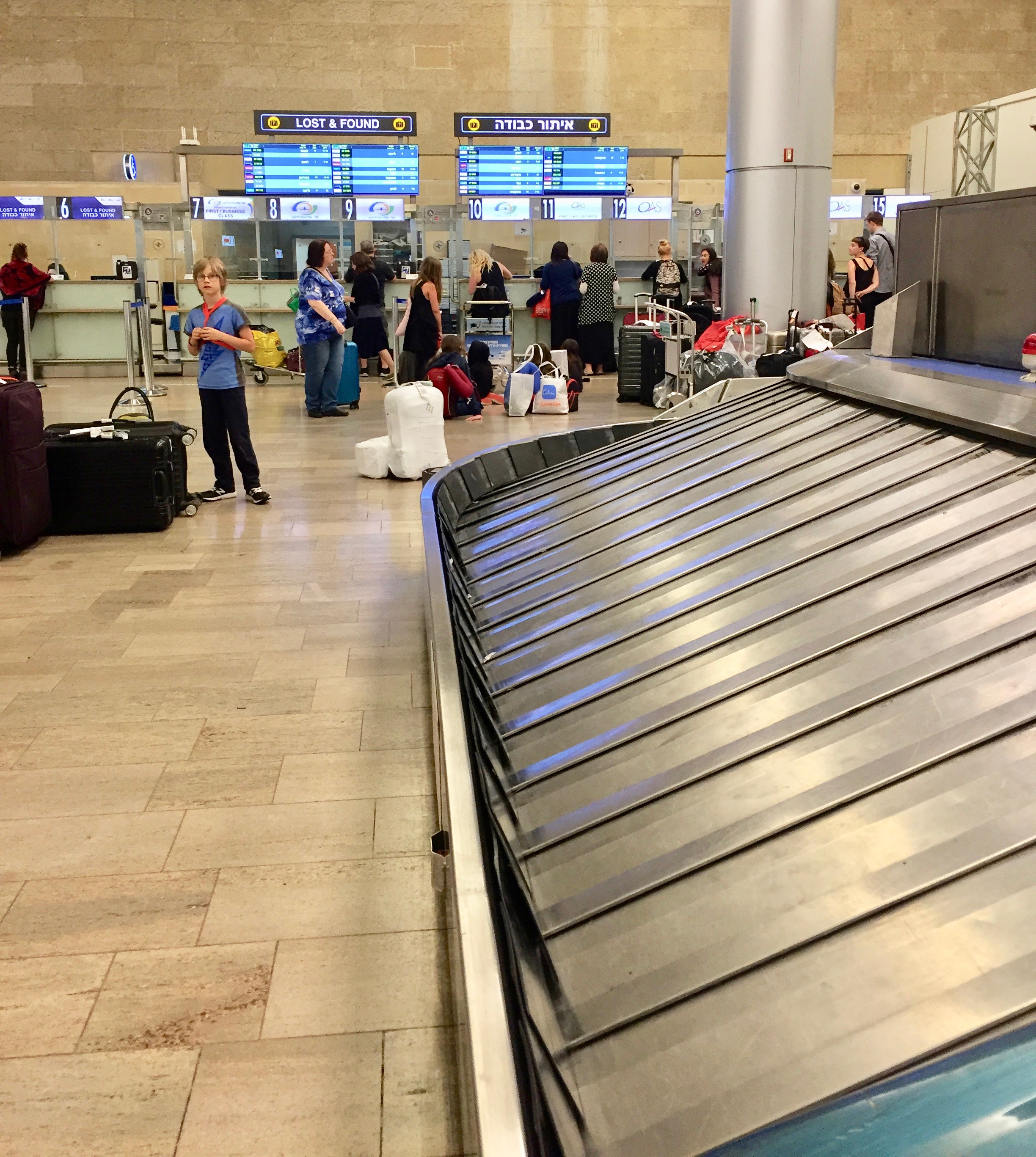 It took some time for us to notice that everyone else on the flight had collected their bags and left, and no more bags were coming, and yet there were still about two dozen people, most of whom had originated with us from JFK, standing around the empty carousel baggage carousel at Ben Gurion aching to get to bed after 19 hours on planes.